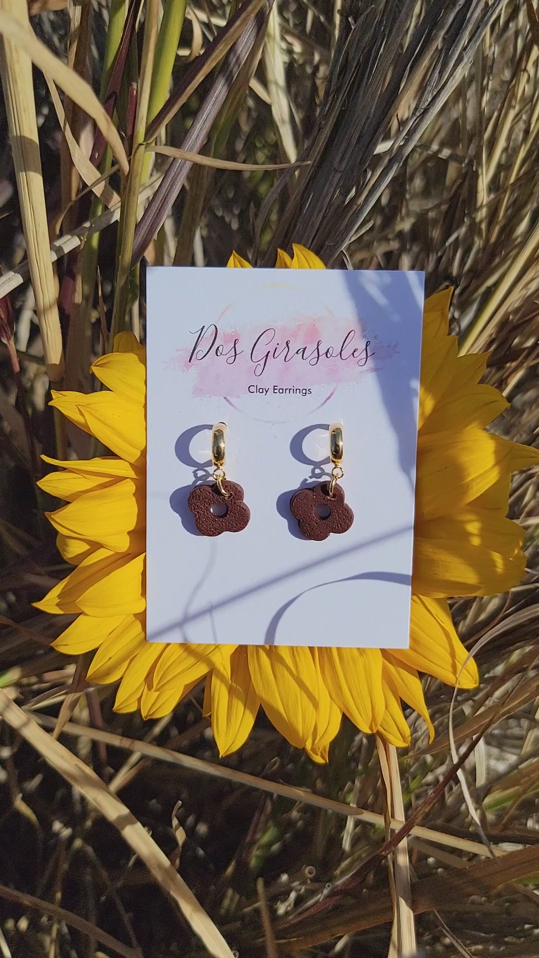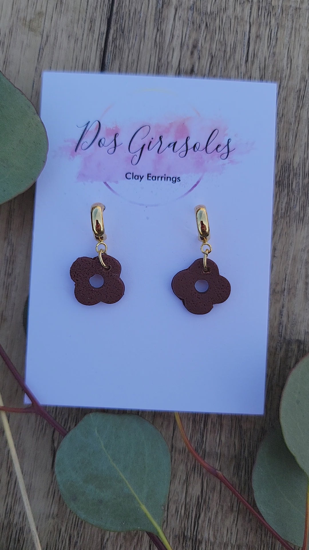 18k gold plated huggies with sterling silver ear stick and a small brown flower. Inspired by the telenovela Gata Salvaje.